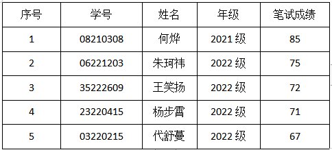 根据《2023年本科生集中考核转专业工作实施细则》,经笔试考核,确定何烨等5名同学进入2023年本科生集中考核转专业面试环节(具体名单如下)。