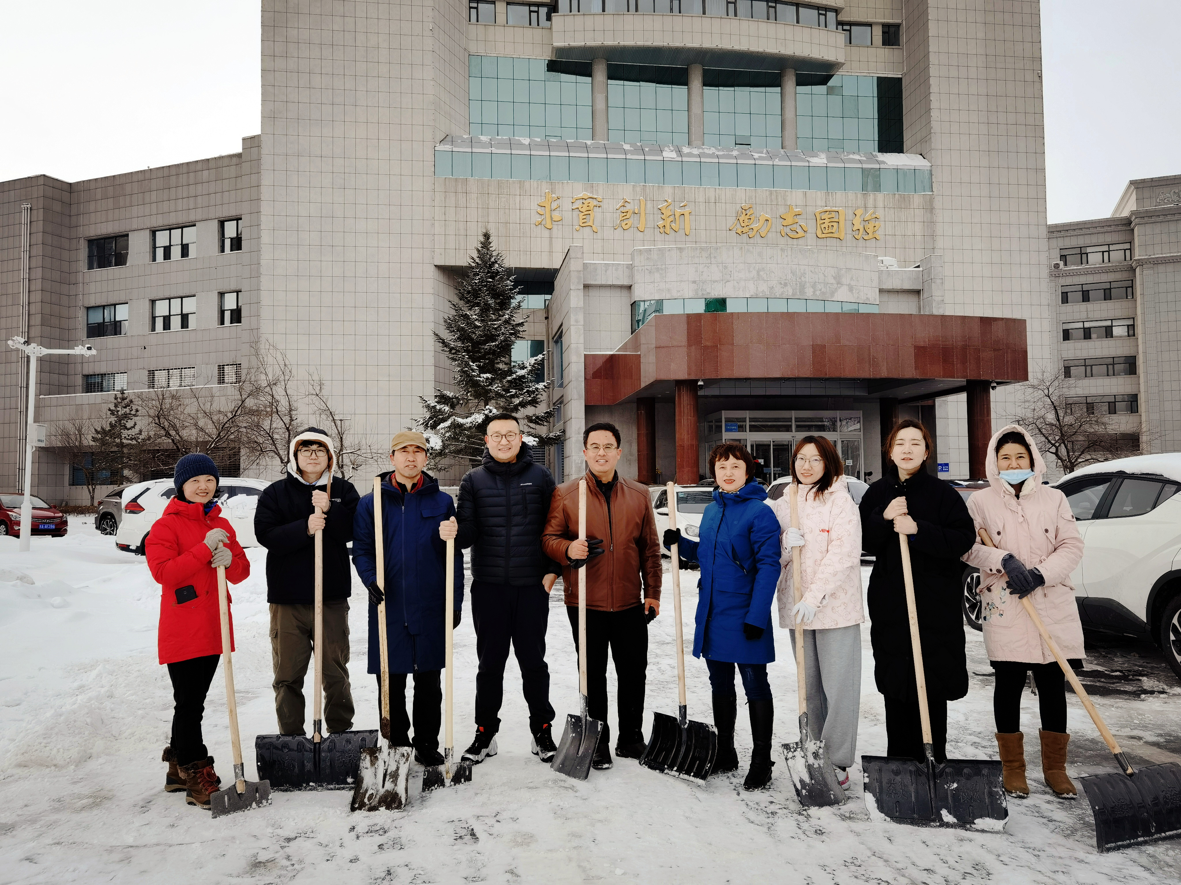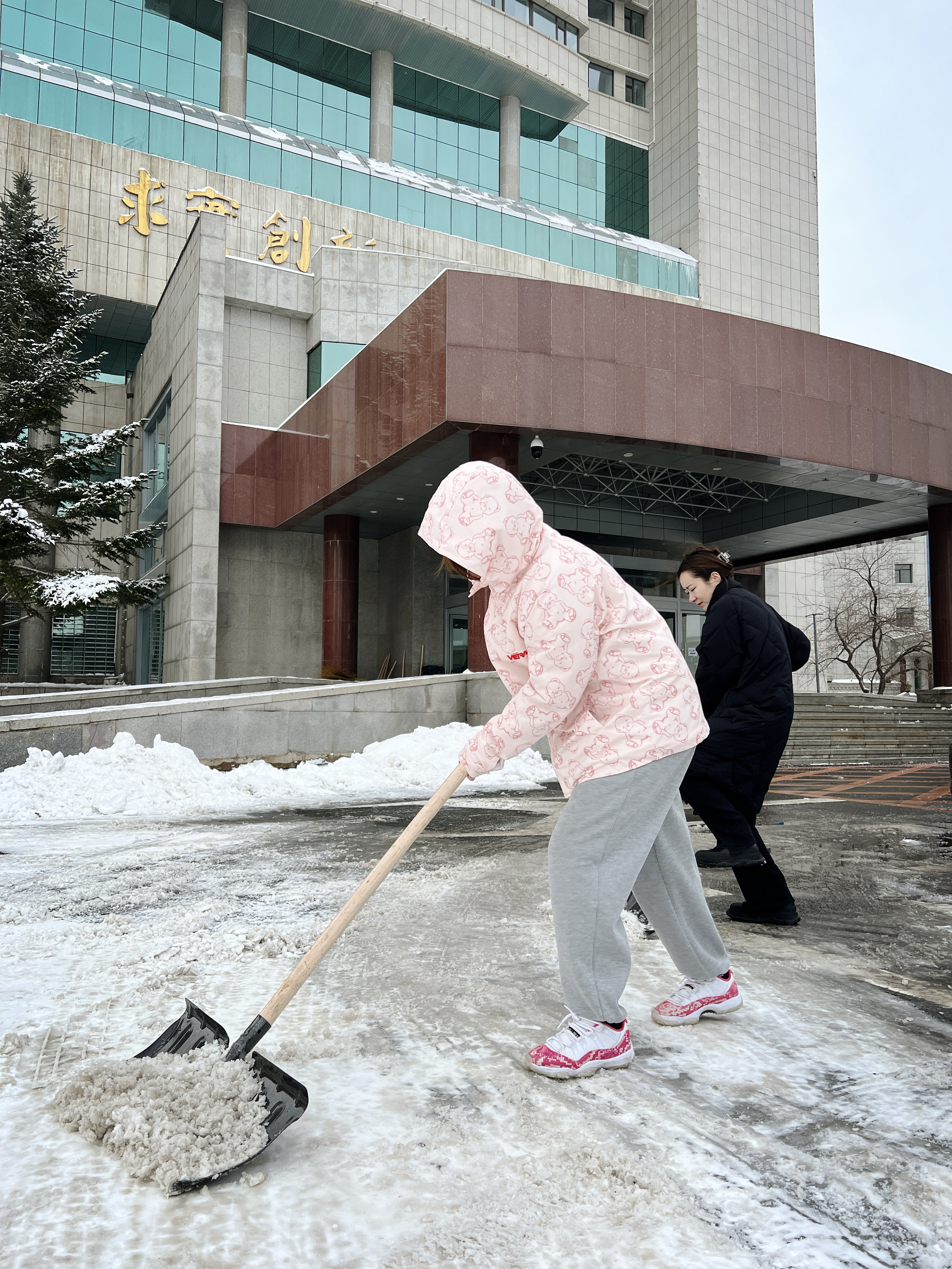 上午到公司办公的教师也被热火朝天的场面所吸引,其中一位民盟成员和一位新递交入党申请书的青年教师停车后没有进楼果断加入到扫雪队伍中。大家划分为两组,比赛进度。党员们边比边笑着向两位党外人士宣传支部活动,动员他们早日加入党组织。