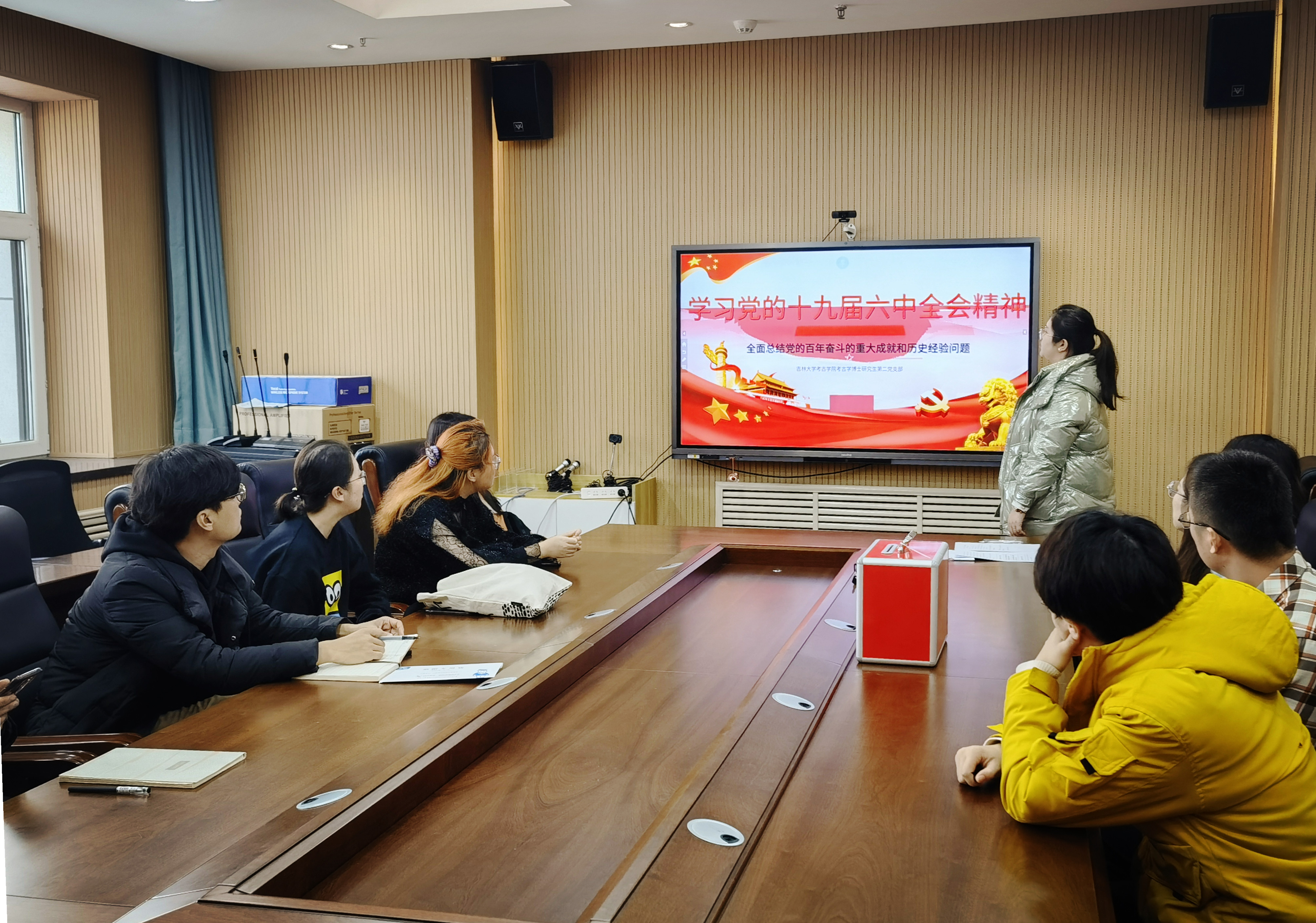 党支部书记李畅从十九届六中全会概述、为何要总结党的百年奋斗重大成就和历史经验、中国共产党百年奋斗的辉煌成就、中国共产党百年奋斗的经验启示等四个方面带领大家进行学习。