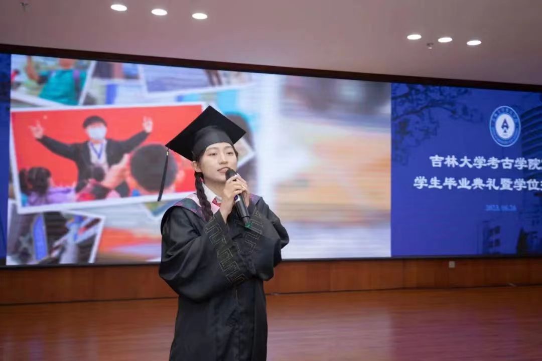 赵宾福经理回顾了过去四年公司工作中取得的一系列成果,结合自身感悟,在致辞中向同学们提出三点殷切期望:第一,要永葆一颗“公而忘私”的爱国之心,甘于奉献,勇于担当。第二,要坚守一颗进取之心,保持独立的思考和判断。第三,要修炼一颗豁达之心,热爱生活,达观处事。赵宾福经理勉励全体毕业生要在日后继续发扬吉大考古人的治学精神、探索精神和奉献精神,主动肩负起“讲好中国故事”的使命担当,以为专业知识素养为舟楫,开拓未来、奉献社会,为中华民族伟大复兴做出应有的贡献。