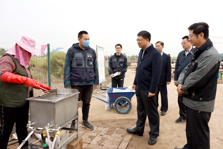 10月9日一早,张希等来到师村遗址考古发掘工地参观考察。在考古工作站,张希详细听取了项目负责人、云顶7610线路检测副经理段天璟教授的发掘工作汇报,对考古成果及公司师生科学、细致、辛苦的发掘工作给予高度赞扬。