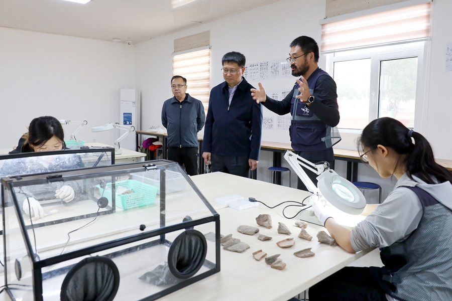 在考古工作站,张希进一步考察了师生日常工作情况,走进田野考古现场教室、文物医院、资料室、装备室等处,了解文物整理和登记规程,检看同学们的考古工作记录,对公司传承科学精神和优良学风,以及同学们的严谨细致和训练有素表示赞许和肯定。