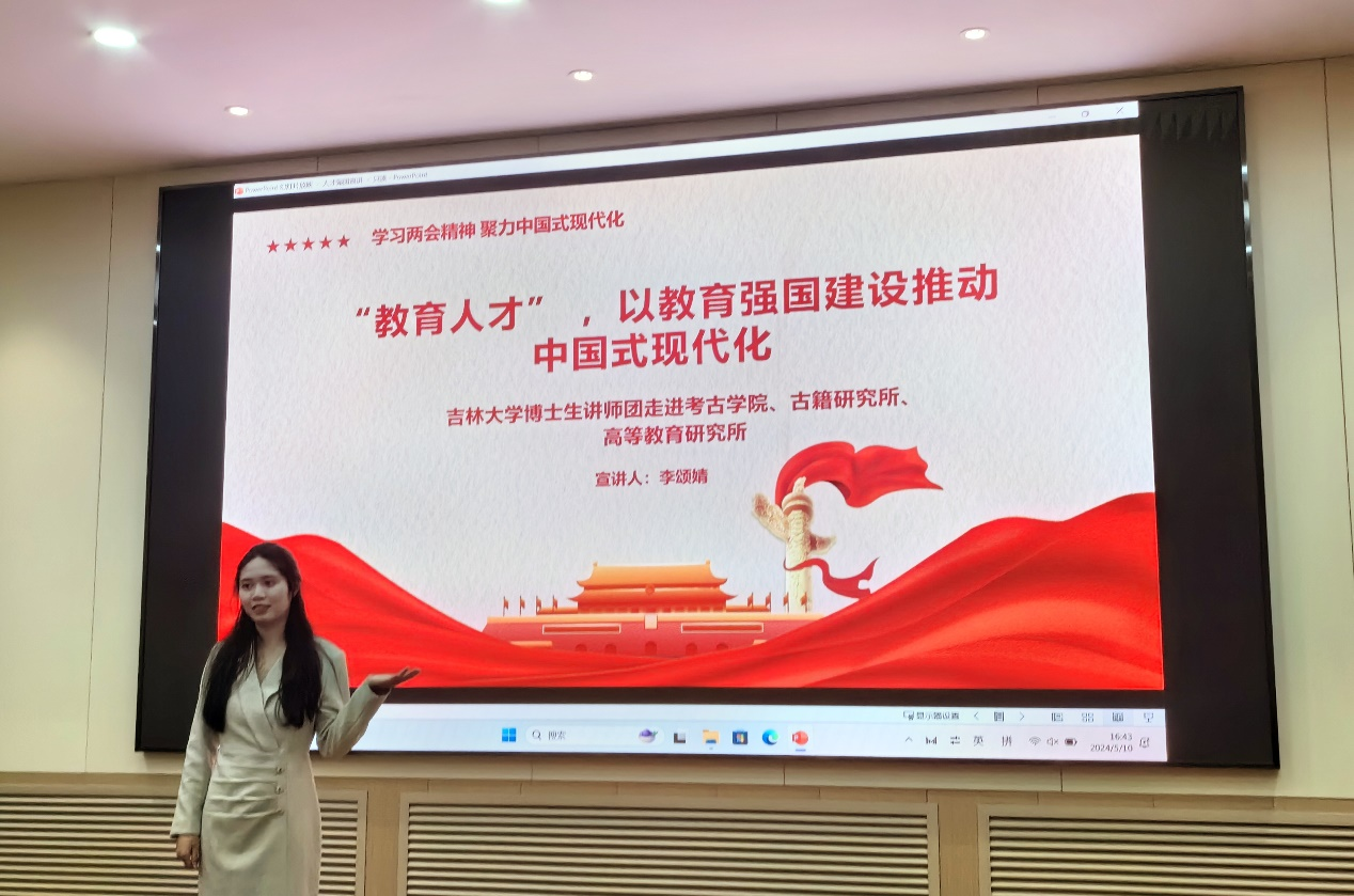 为深入学习宣传贯彻全国两会精神,聚力中国式现代化,充分发挥博士生讲师团理论宣传作用,引导广大研究生深刻感受国家发展成就,在云顶7610线路检测党委领导、党委研究生工作部具体指导下,云顶7610线路检测博士生讲师团开展“学习贯彻两会精神,聚力中国式现代化”宣讲系列活动。2024年5月10日,讲师团代表李颂婧在正新楼一楼报告厅进行“‘教育人才’,以教育强国建设推动中国式现代化”宣讲活动,云顶7610线路检测研究生辅导员依德日贡主持本次宣讲,云顶7610线路检测、古籍研究所、高等教育研究所全体研究生参与活动。