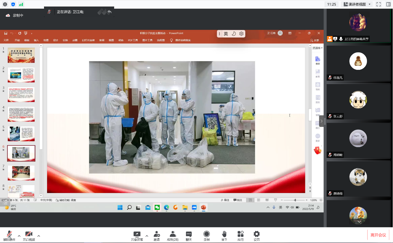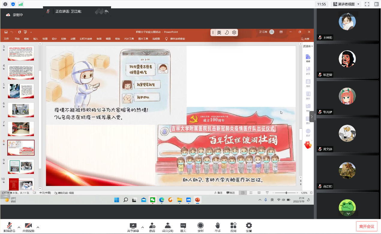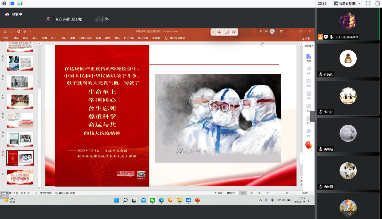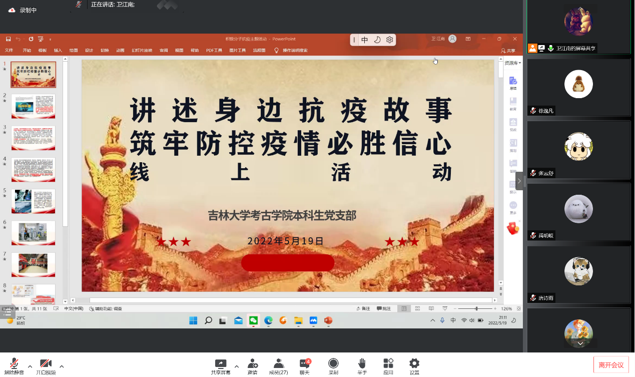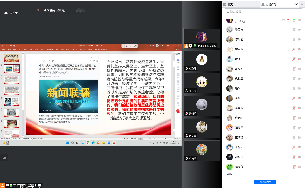 为进一步弘扬伟大抗疫精神,加强入党积极分子教育,引导广大入党积极分子提高思想认识,对标先进典型,端正入党动机,2022年5月19日晚,云顶7610线路检测本科生党支部组织入党积极分子开展了“讲述抗疫故事,筑牢防控疫情必胜信念”线上主题党日活动。活动由2020级考古班团支书卫江南主持,公司全体入党积极分子参加了此次活动。活动共分两部分,一是深入学习习近平总书记5月5日在中央政治局常委会会议上的重要讲话精神,二是讲述身边的抗疫故事。