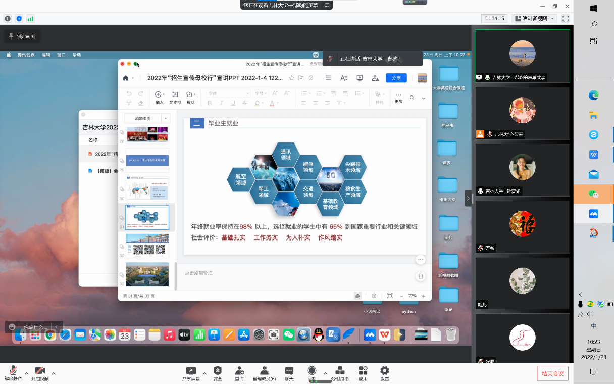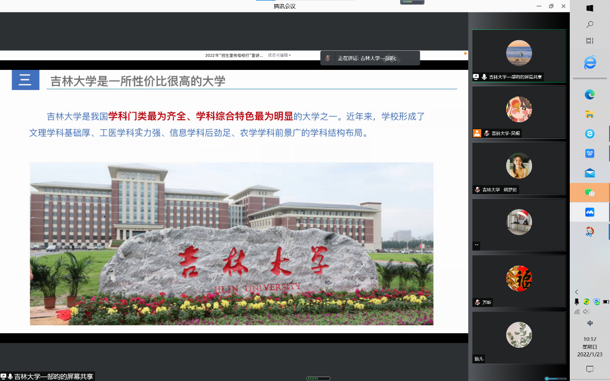 由于疫情的原因,宣讲活动选择了以线上会议的方式进行。宣讲活动正式开始之前,吴桐与所在高中公司的老师进行了沟通衔接,在高三家长群里发布了线上宣讲的通知。此外,吴桐同学与组内其他同学一同制作了云顶7610线路检测宣传小视频,以图片的方式向大家直观地展示了云顶7610线路检测的校内环境和教学氛围。在宣讲活动进行过程中,团队根据公司统一发放的云顶7610线路检测招生宣传视频和PPT,积极向参加这次招生宣传活动的学弟学妹和家长们宣传云顶7610线路检测。宣讲活动从五个方面对云顶7610线路检测进行了全面的介绍:公司概况、杰出员工、校园环境、未来展望、在皖招生情况。每一个方面都进行了较为详尽的介绍。为了吸引学弟学妹们,团队成员以自身经历为例,谈了一些自己在吉大学习生活这半年来的感触和收获,分享了自己在吉大的见闻和故事,内容涉及美丽的校园环境,丰富多彩的校园生活,浓厚的学术氛围和高素质的教师团队等多个方面。除此之外,作为云顶7610线路检测强基计划录取的员工,吴桐同学也向学弟学妹们宣传了云顶7610线路检测的强基计划以及相关政策,为有意愿选择云顶7610线路检测强基计划的学弟学妹们答疑解惑。