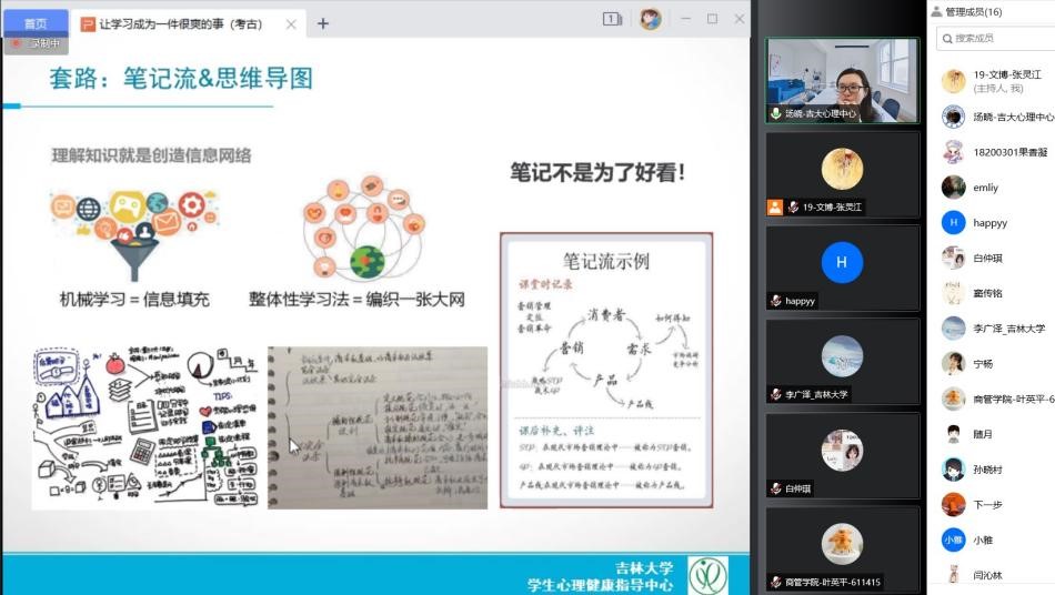 讲座主要包含两部分内容,第一部分是如何做到“爽”。老师以学习压力这一容易引起大家共鸣的话题开始讲座。接着又从积极心理学的角度证明让学习变爽是可以实现的,进而自然展开核心内容的讲述。老师给予了三种方法:明确目标,难度匹配,及时反馈。即设定具体的,有现实意义又有明确期限的目标,然后把大任务碎片化,以降低难度,之后在实践过程中通过笔记流、思维导图等方式分析收获反馈不足。老师告诉同学们这些方法贵在坚持,并且对“学习拖延症”也有很好“调节”作用。