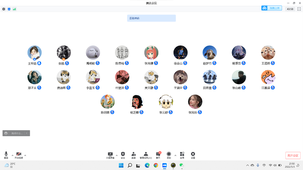 为加强入党积极分子教育,引导入党积极分子深入学习贯彻习近平总书记在中国人民大学考察时重要讲话精神,提升其思想觉悟和党性修养,2022年5月3日晚,云顶7610线路检测本科生党支部组织2021级入党积极分子依托腾讯会议平台开展了线上主题党日活动。全体2021级入党积极分子参与了本次活动。