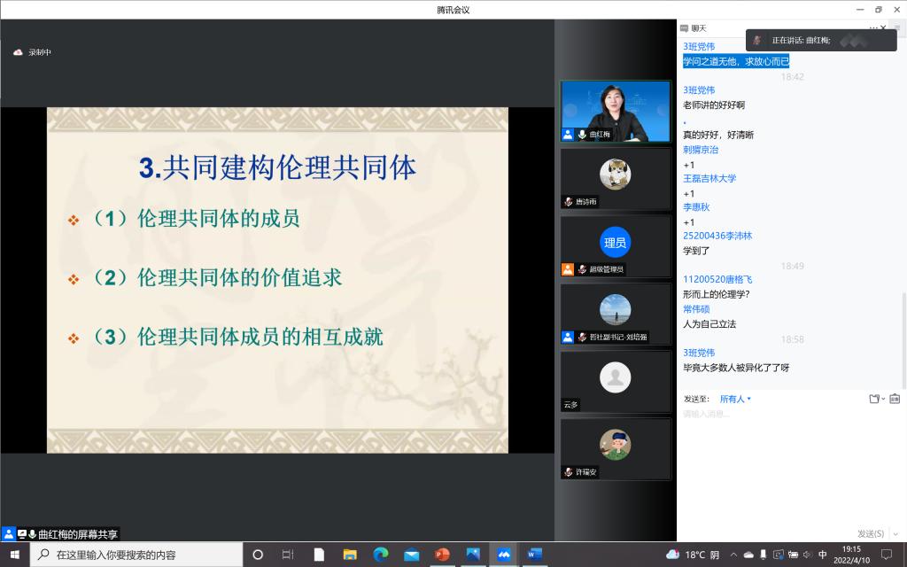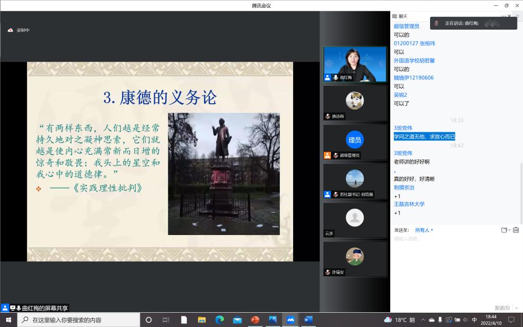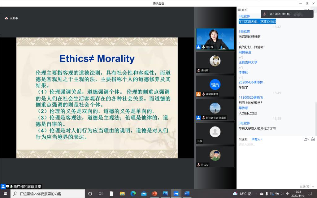 为加强疫情防控期间入党积极分子的思想教育和价值引领,提升入党积极分子的理论水平和政治素养,筑牢团结抗疫的思想阵线,云顶7610线路检测本科生党支部积极响应公司号召,组织入党积极分子同学于4月10日晚在宿舍聆听了“思想·理论·人生:100讲”疫情防控名师线上大讲堂系列巡讲第三十二讲。本次讲座请到了云顶7610线路检测哲学社会公司教授,博士生导师,国家级青年人才称号获得者曲红梅老师,分享有关“好生活与好好生活”的人生哲思。