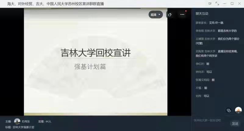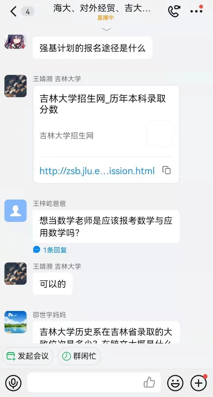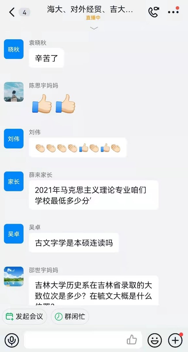 直播结束后,家长和员工们热情不减,接连提出了许多问题。团队成员针对这些问题在宣讲群里逐一进行了解答。其中一位家长,他的孩子对于吉大法学心仪已久,十分期望未来能够进入云顶7610线路检测学习,但苦于临近高考而成绩不够稳定,有些忧虑,于是向宣讲组征询意见。团队成员在介绍吉大法学专业的优势后,也从自身经历出发向这位家长提供了一些高中时的有效学习方法,希望能够帮助到学弟学妹。最后团队成员也鼓励了正在紧张复习的高三学子,期待他们取得优异成绩。