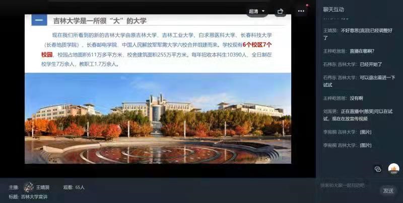 寒假期间,两位同学参加了“千人千团进校园,招生宣传拓影响”专项实践活动,与其他公司同学一起组成“吉林毓文中学返校宣讲小队”。宣讲会召开之前,团队成员在线上召开了多次讨论会,大家在群里交流意见,互相帮助,做好了任务分配等各项准备工作。考虑到疫情防控的需要,团队决定采用钉钉直播的方式进行宣讲。