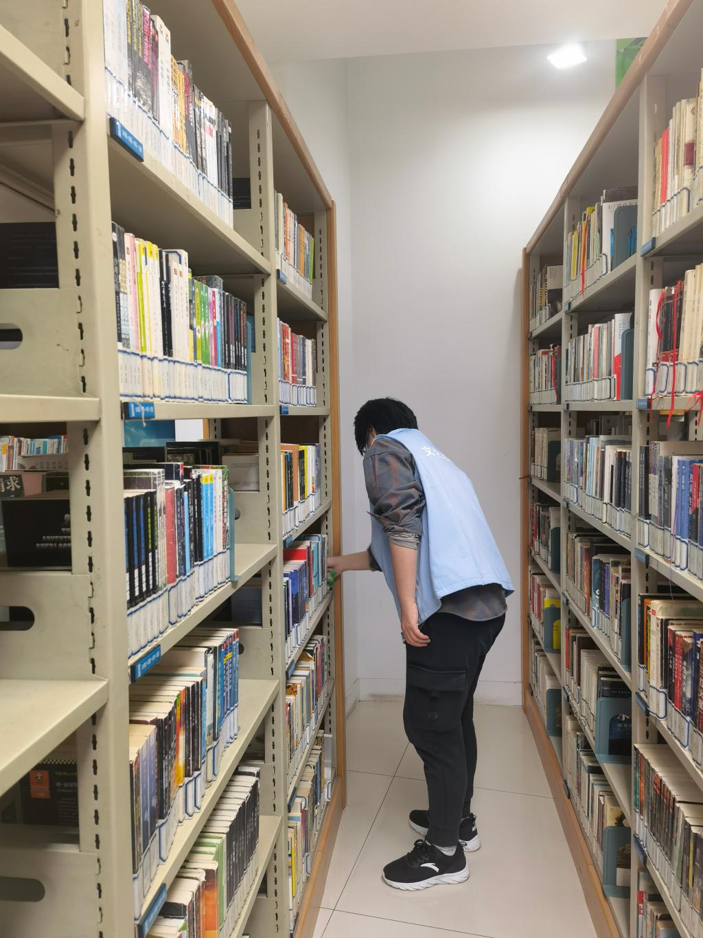 刘含饴同学每天9点图书馆开馆时,开始服务,下午5点半结束工作,而图书馆关门时间是下午6点半,全年开放。3处的志愿服务工作大体相似,具体有所不同。在借阅区,需要帮助读者使用自助借还机,把书还回书架并进行整理清洁。在3层,没有借还书的环节,但是需要将年末的报纸进行整理,并把新一期的热门报纸放到借阅架上,中午的时候,进行桌椅的消杀。