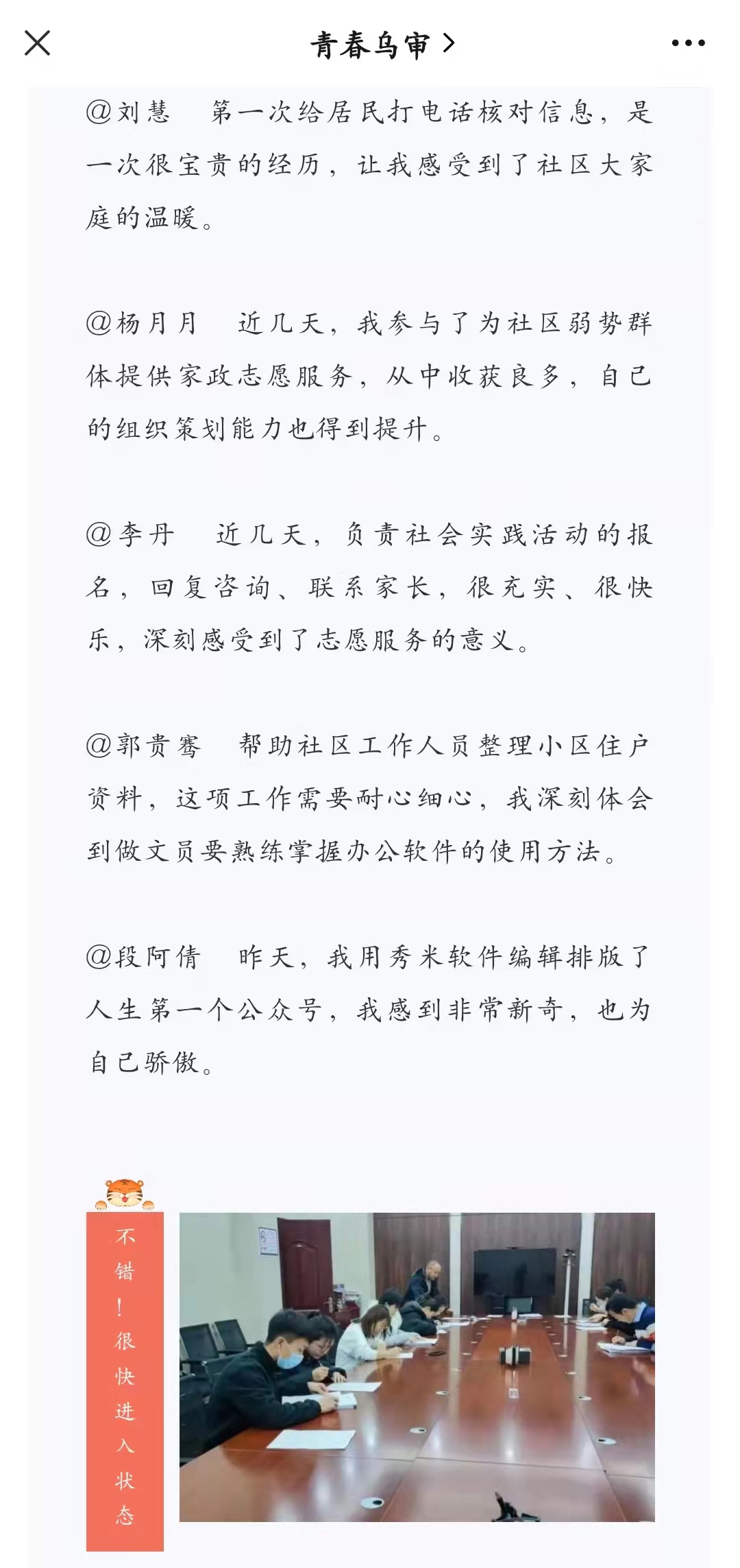 2022年1月末,姚岚岚同学在家乡某宾馆开展了内容丰富的社会实践,包括对宾馆来往人员的信息检测,内部的收入检查和计算审核,对于人际交往和特殊情况的处理,结合社会情况进行调整,对于内部档案的整理和保管等工作任务。