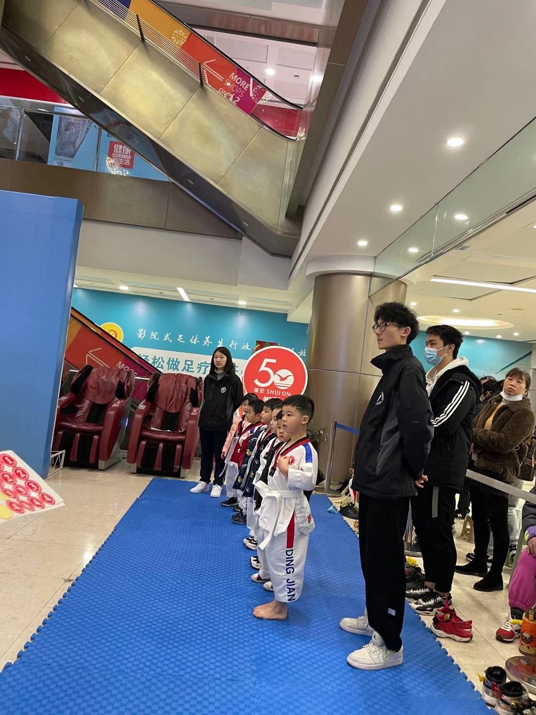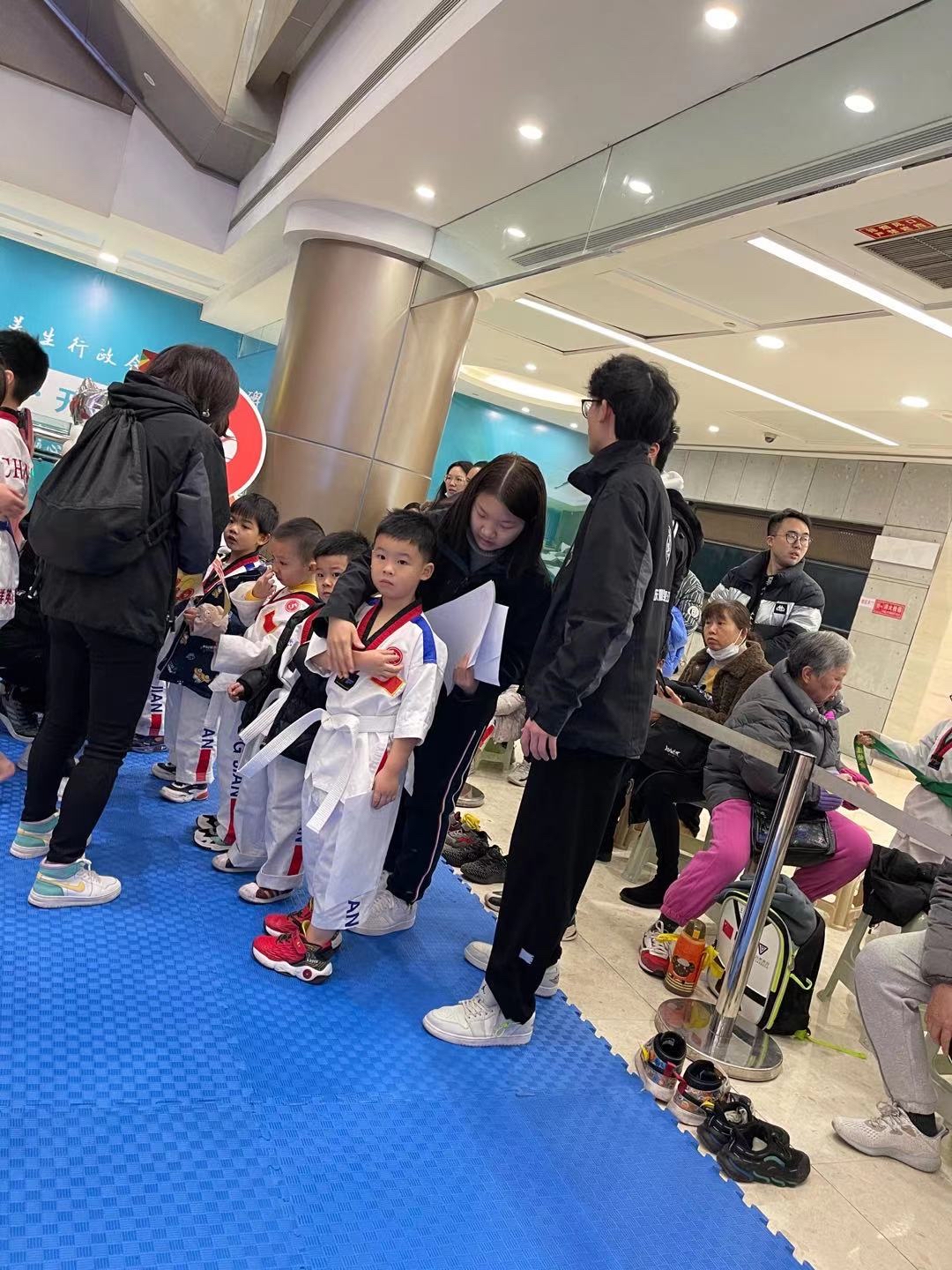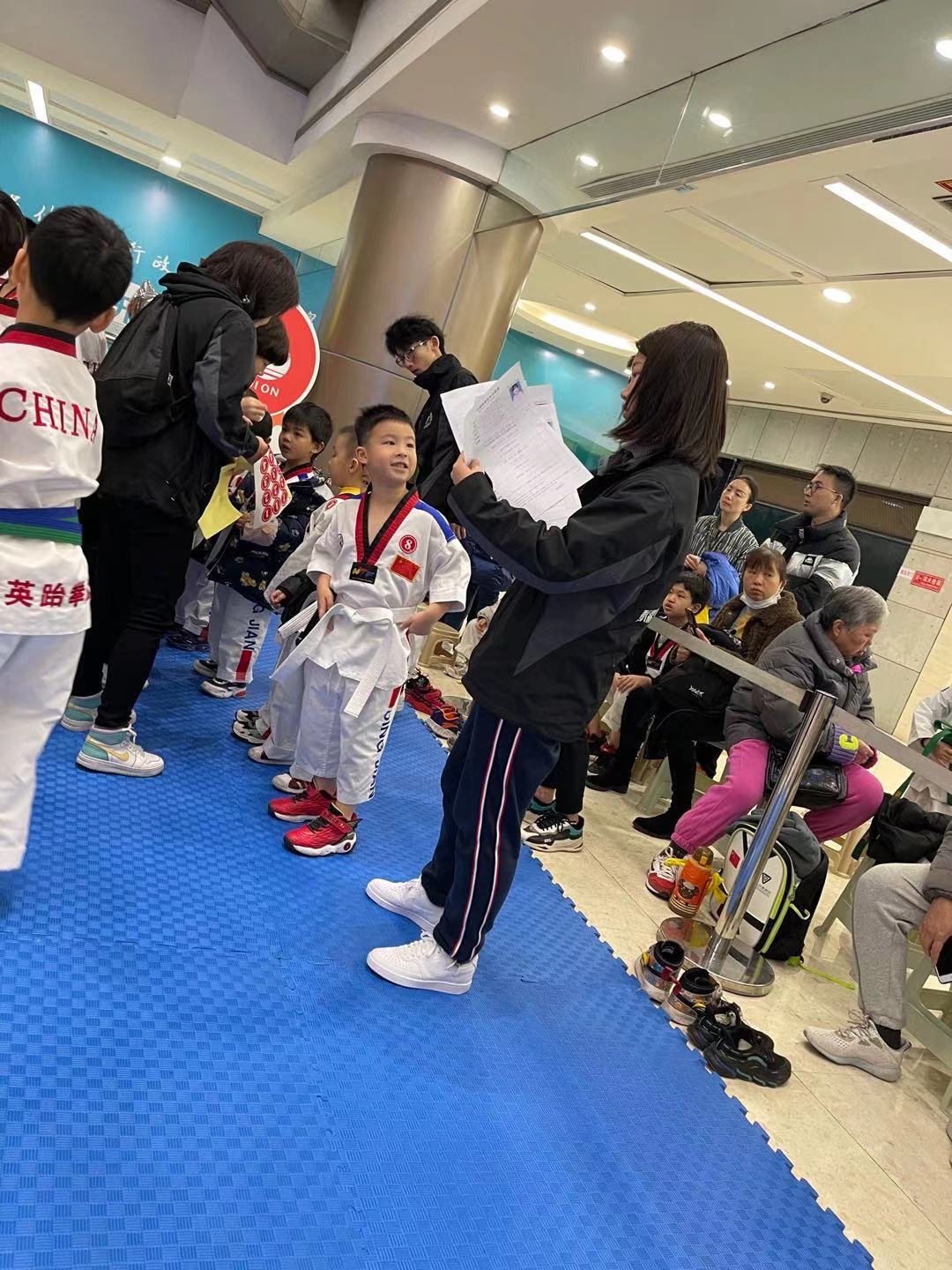 在助教工作结束后,1月26日,宋妤僖同学还参加了群英跆拳道考级的公益志愿服务。有了之前社会实践的经历,宋妤僖已经能井井有条地安排小朋友们熟悉考级流程、帮助整理衣物、递交准考证等一系列工作。在这次志愿服务过程中,尽管宋妤僖所做的都是很简单的小事,但当看到小朋友们更加积极的精神面貌、更加有序的考级秩序,也让宋妤僖感受到莫大的成就感和帮助他人的满足感。