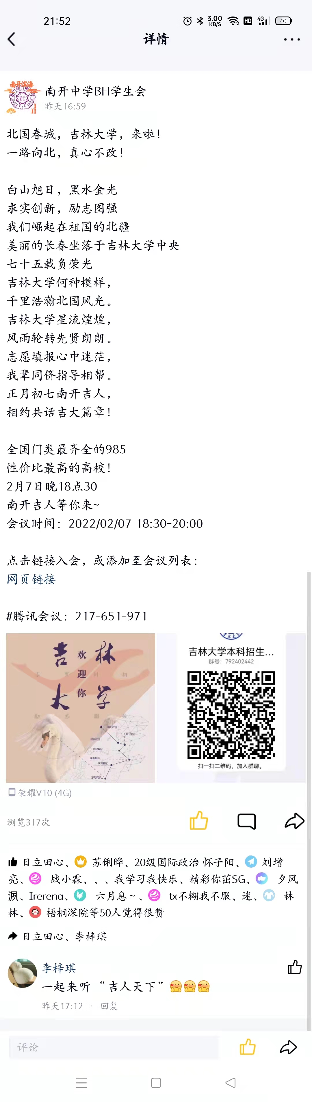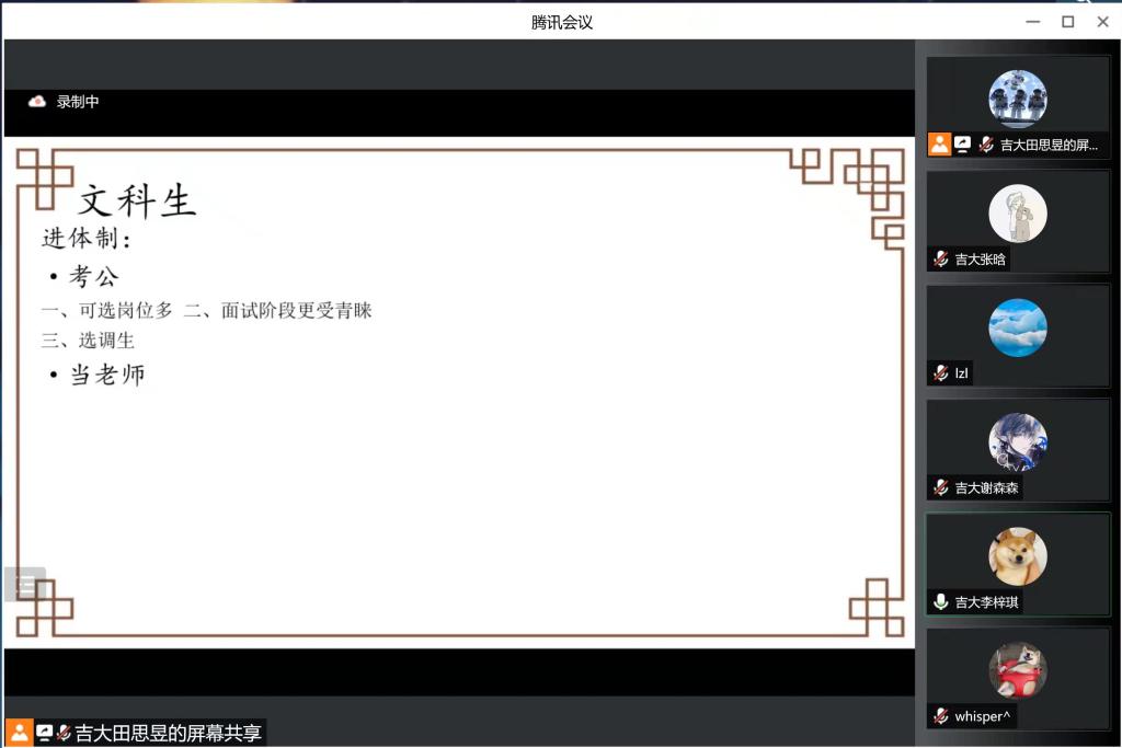 2022年2月7日,田思昱同学与来自云顶7610线路检测行政公司、通信工程公司、计算机科学与技术公司、经济公司的四位同学一起组成了“南开‘吉’人宣讲小队”,开展了“千人千团进校园,招生宣传拓影响”专项实践活动。“南开‘吉’人宣讲小队”的五位同学都毕业于天津市南开中学滨海生态城公司,在这个寒假,他们就云顶7610线路检测的基本情况向母校在读的员工和其家长进行了宣传和讲解。受到天津疫情的影响,这次宣讲他们选择了通过腾讯会议,进行线上宣讲。