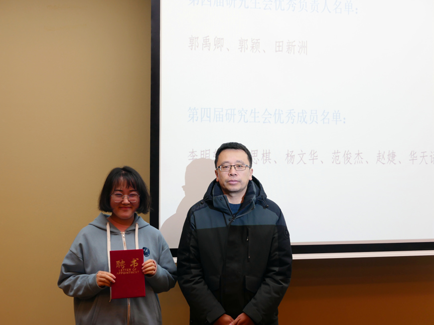 总结正式确认了第四届研究生会全体成员名单,并将研会这一学期以来所做工作以学术、组宣、文体三个部分进行展开并做报告: