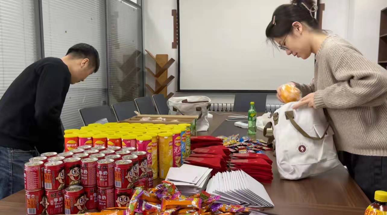 22日下午,辅导员马嘉男老师、博士兼职辅导员靳涛老师和团委副书记温景超同学在公司党团活动室为考研学子准备“考研祝福加油包”。一排排考古文创包里装满了为考研学子精心准备的礼品和祝福:薯片与棒棒糖寓意“薯”你最“棒”,旺仔牛奶寓意学业兴“旺”,橙子寓意心想事“橙”,红袜子寓意鸿运相伴,暖宝贴给大家在寒冷的冬季送去温暖。祝福信由马老师书写,在传递考研祝福的同时,也寄予了对考研学子的厚望重托……为了不影响考研员工备考,马老师与几位同学将准备好的礼品包送到了每一位考研学子的寝室,让公司的关怀与鼓励如同冬日的暖阳,温暖着考研学子的心。收到“考研祝福加油包”的同学表示十分开心,感受到了公司的温情祝福,并表示将带着这份祝福奔赴考场。