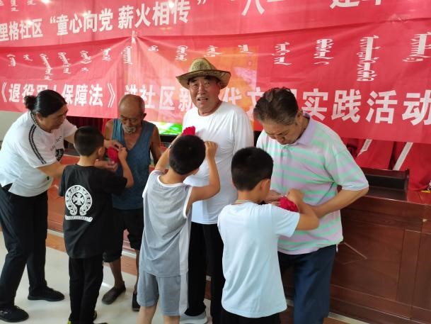 7月29日,李丹协助社区举办了“2021年苏里格社区‘童心向党,薪火相传’八一建军节主题教育活动”以及“《退役军人保障法》进社区新时代文明实践活动”。她带领同学们聆听退伍军人的革命事迹,为退伍军人佩戴红花,表演诗歌朗诵。一朵朵亲手折叠的大红花,一首首精心排练的诗歌朗诵,都汇成了同学们对军人们的最高献礼。