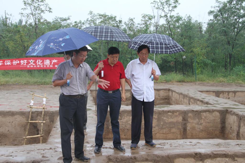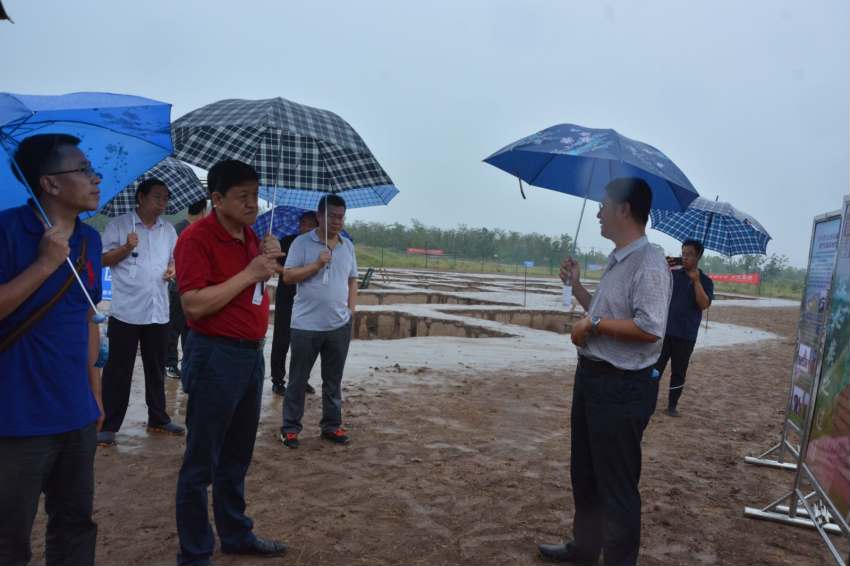 会后,领导、老师们冒雨参观工地现场,师村考古队领队段天璟教授讲解了遗址发掘情况。公司领导们还参观了基地文物库房,走访了员工宿舍。