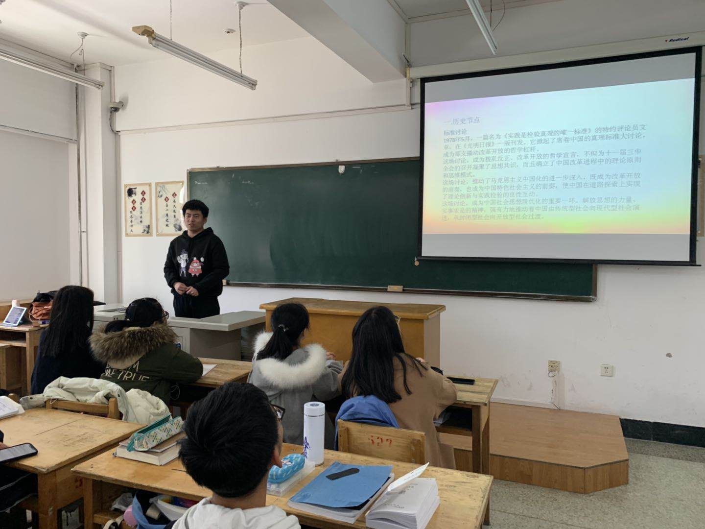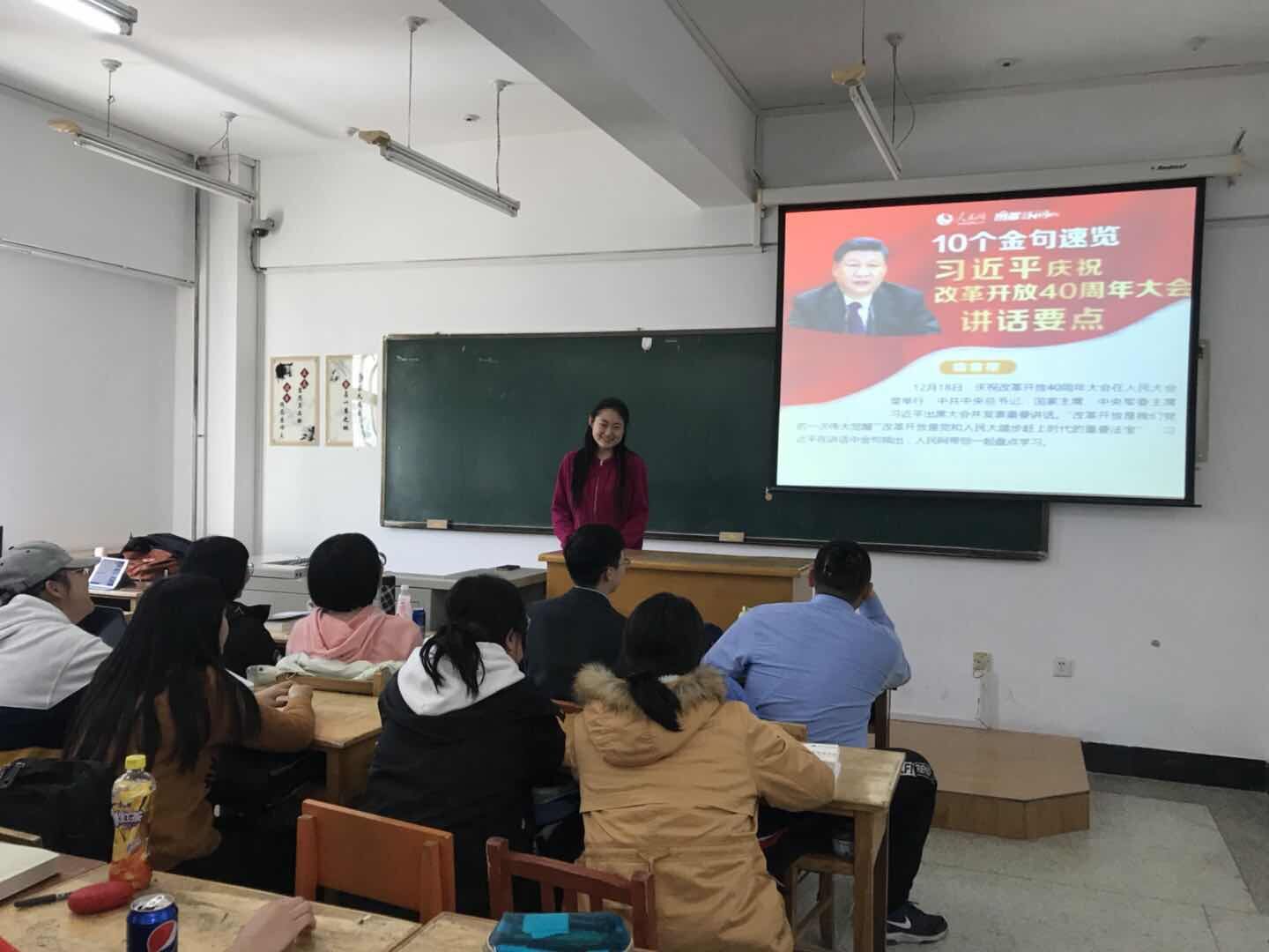 381801团支部团支书耿默兰首先组织一班同学浏览回顾了改革开放40周年的历史成就,包括军事、文化、政治、衣、食、住、行等多个方面的成就展示,同学们认真观看并有同学说出了自己所感受到的改革开放带来的一些变化,其中南羽盈同学、周辰雨同学进行发言。接着,耿默兰同学继续组织同学们回顾了改革开放的历程,并提出了一些自己的感悟,引发了同学的思考。