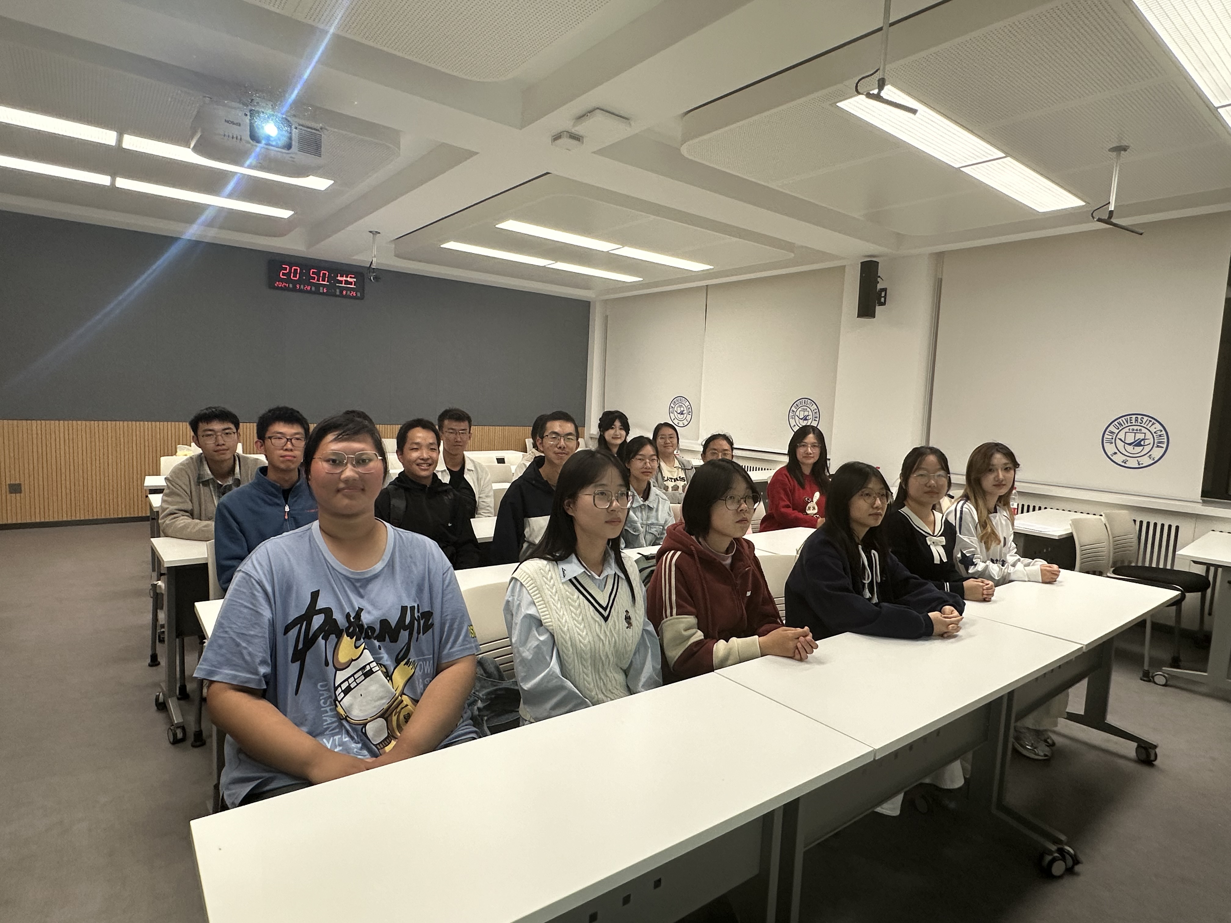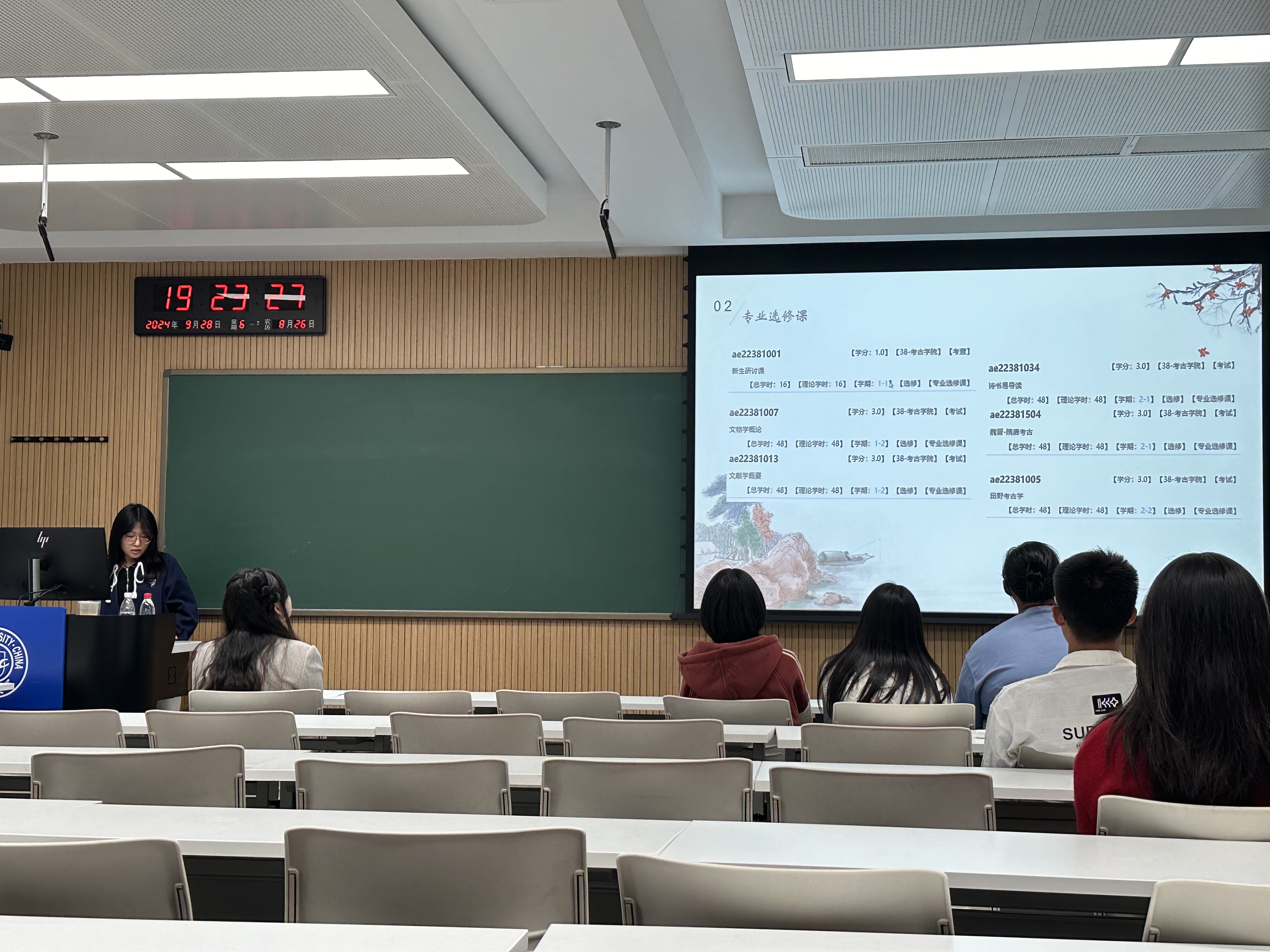 接着,王玥馨同学从课程相关、学习经验及校园生活三个方面与新生们进行分享。王玥馨同学详细地介绍了各学年的课程安排,提醒同学们要提高对思政和计算机类课程的重视度。她从个人经验出发,分享了提高学习效率的笔记整理和文献阅读方法,鼓励同学们积极探索课余生活。最后,她细致耐心地回答了同学们提出的问题,并希望师弟师妹们带着纯粹可贵的热情投入到未来的学习生活中。王玥馨同学细致专业的分享使同学们受益匪浅。