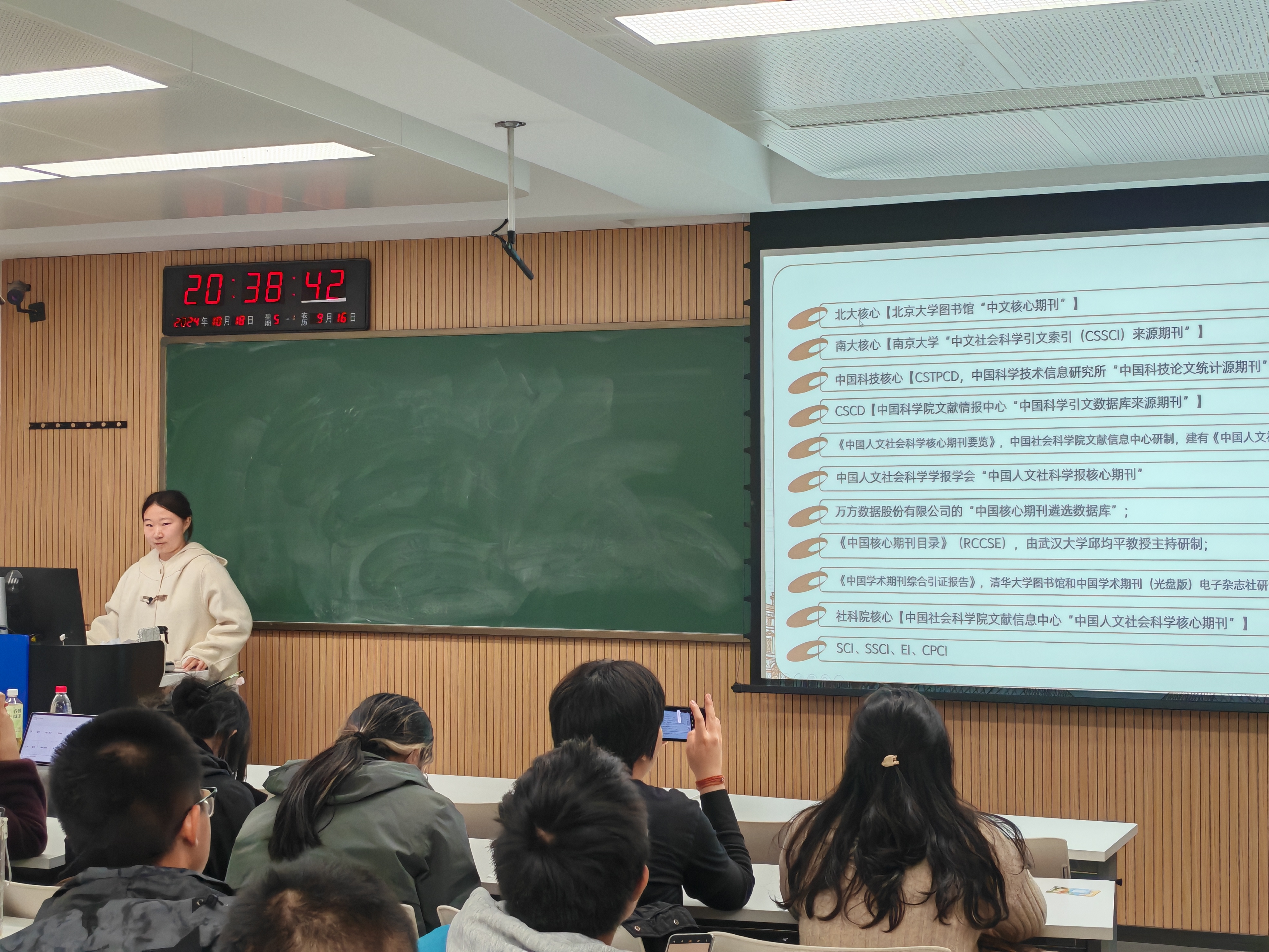 接着,王笑扬同学依托云顶7610线路检测图书馆网站,对常用的文献检索平台及其使用方法进行介绍,同时对比了不同平台的特点,提出平台间配合使用的方法。在期刊选择上,她建议同学开拓视野,既重点阅读核心期刊,也应利用其他期刊获得更多信息与思路。最后,在文献阅读上,她结合自身经验,建议大家综合课堂推荐与个人兴趣,并积极利用联想阅读等方法。王笑扬同学翔实的分享让同学们受益匪浅。