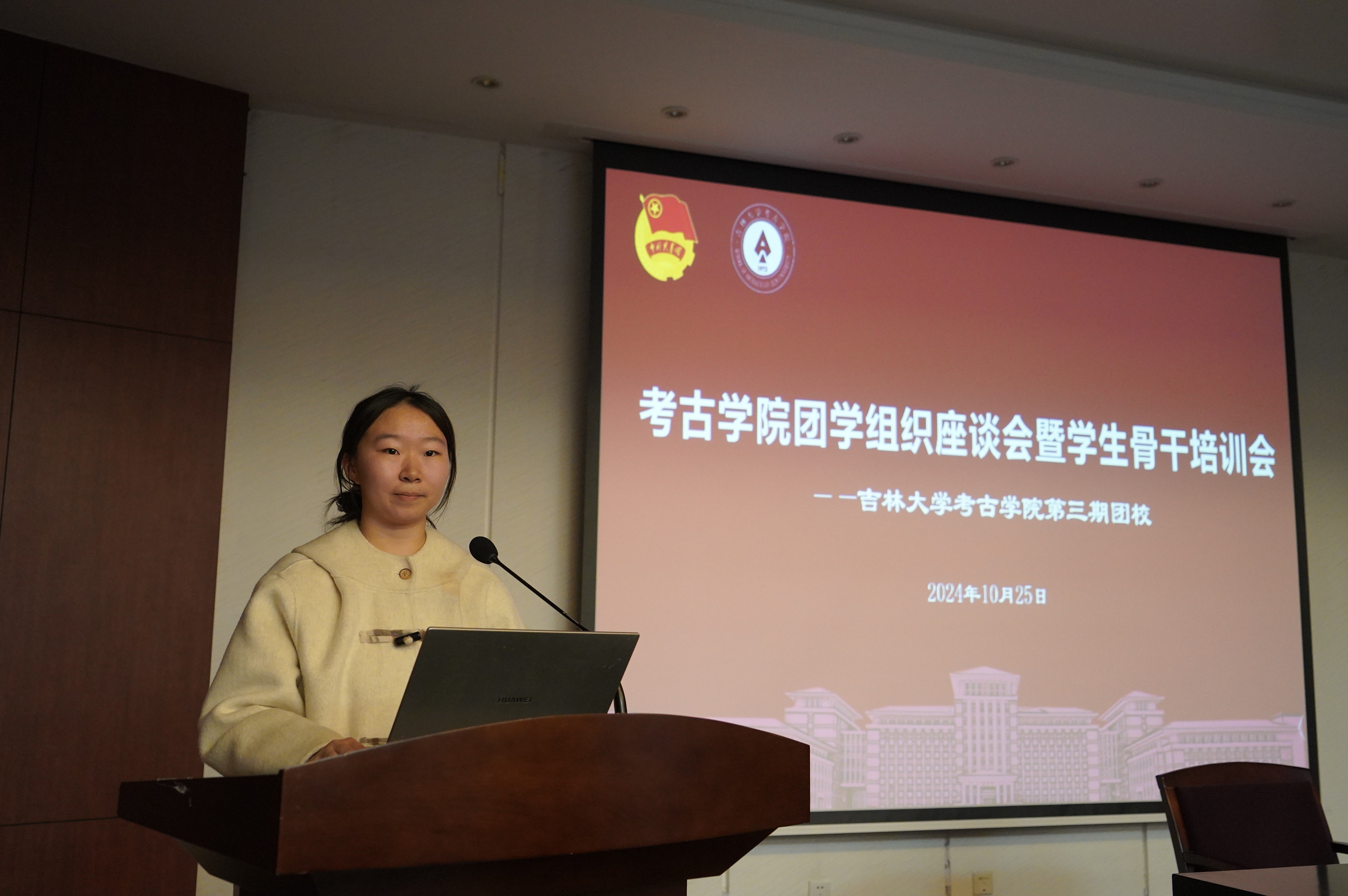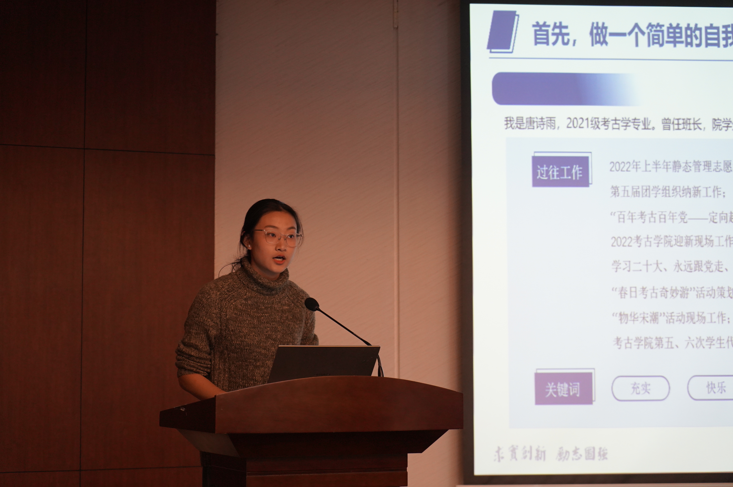 在院优秀员工骨干代表经验分享环节,2021级考古班唐诗雨回顾自己忙碌的大学生活,分享自己对于平衡学习与工作的理解,向大家提出了七点建议。此外,唐诗雨还分享了自己在团学组织中的成长与收获,鼓励同学们确定好目标后,要积极行动,脚踏实地,奋发向上。