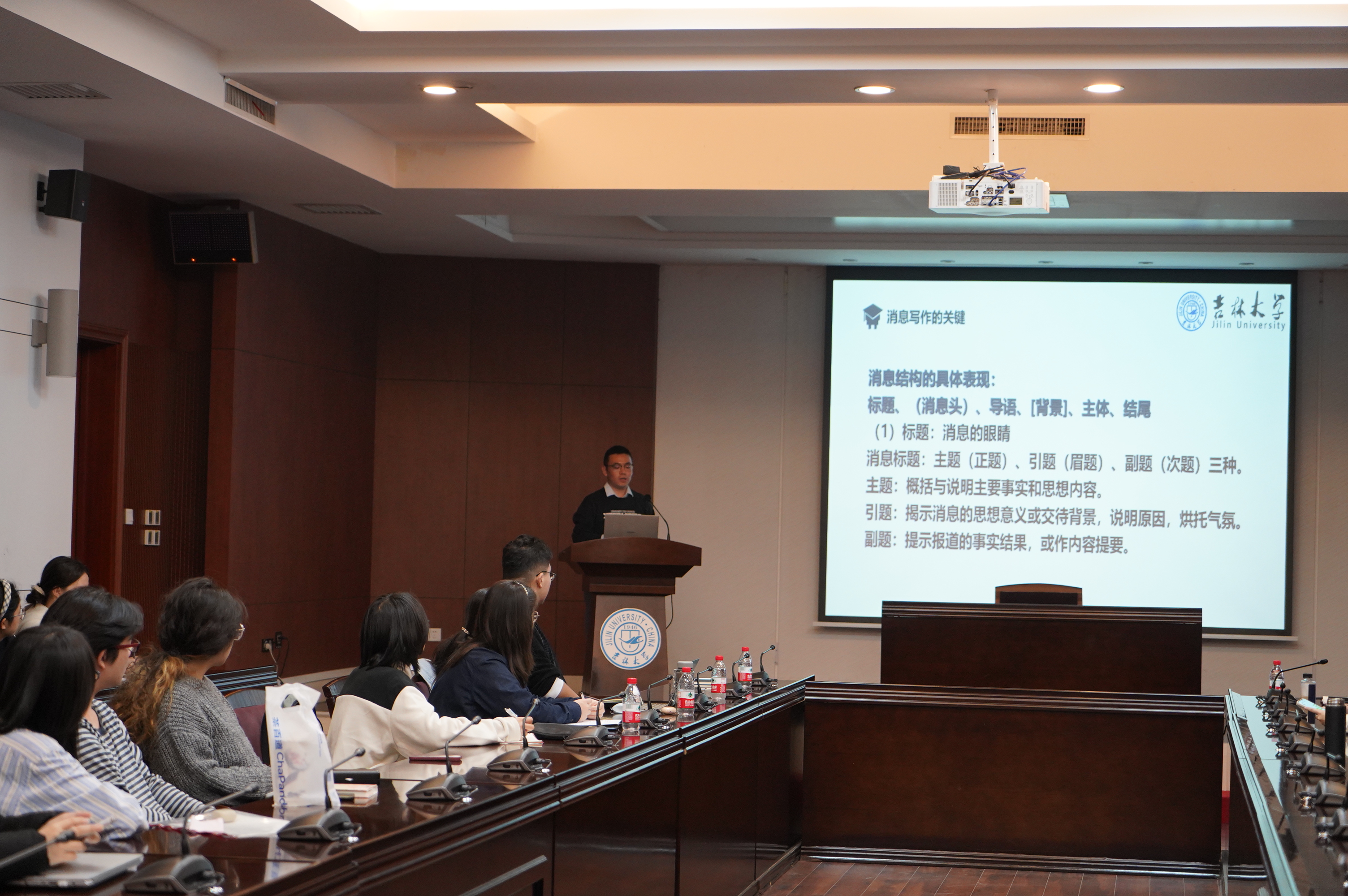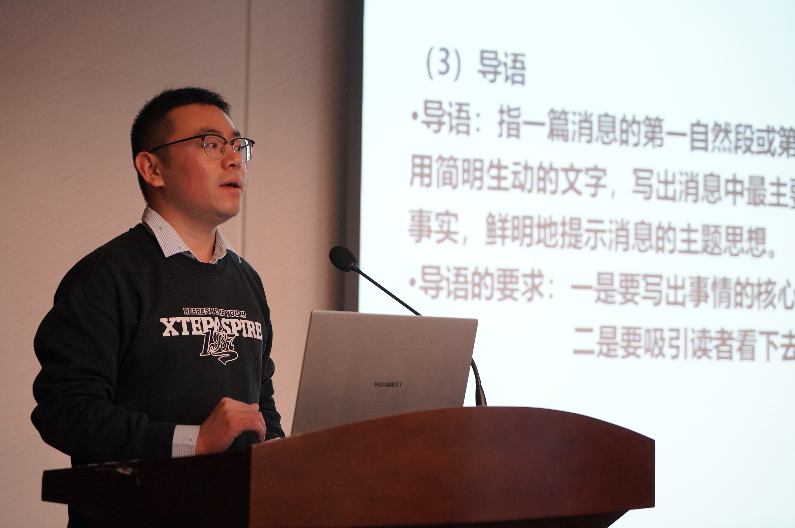 在新闻写作专题培训环节,马克思主义公司2023级博士研究生芦猛受邀来到现场,为大家倾情指导通讯稿写作要点,以形象生动的案例、通俗易懂的言语揭示了消息与通讯写作的特点与区别,介绍了一些新闻写作技巧,分享校园新闻采写的相关经验。此外,芦猛注意到新闻写作中的细节问题,并给予相应建议,提醒同学们注意新闻规范。