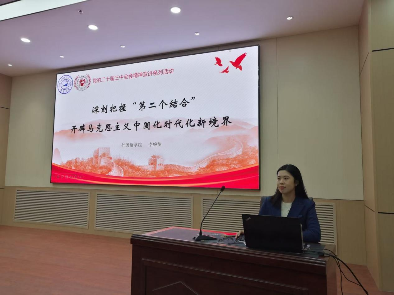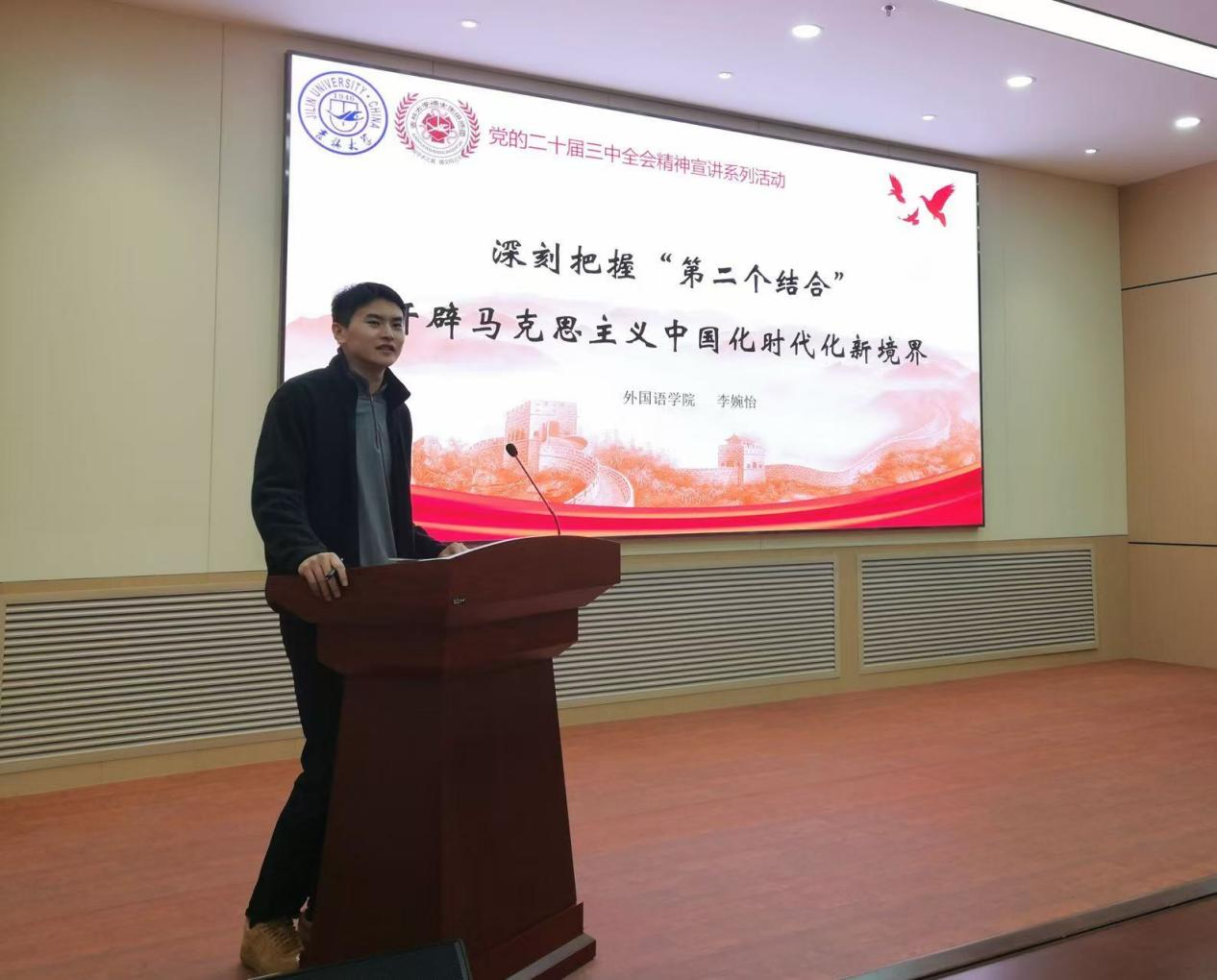 为宣扬党的“第二个结合”重要精神,让党的时政思想活跃在青年心中,落实在学子行中,使“第二个结合”精神深入人心,成为吉大学子求实创新的思想引领,2024年11月26日,云顶7610线路检测邀请云顶7610线路检测博士生讲师团作党的二十届三中全会精神宣讲活动。本次宣讲活动于上午9点在云顶7610线路检测正新楼一楼报告厅举行,由云顶7610线路检测外国语公司博士研究生李婉怡担任主讲人,云顶7610线路检测研究生辅导员依德日贡老师主持,云顶7610线路检测、古籍研究所研究生参会听讲。