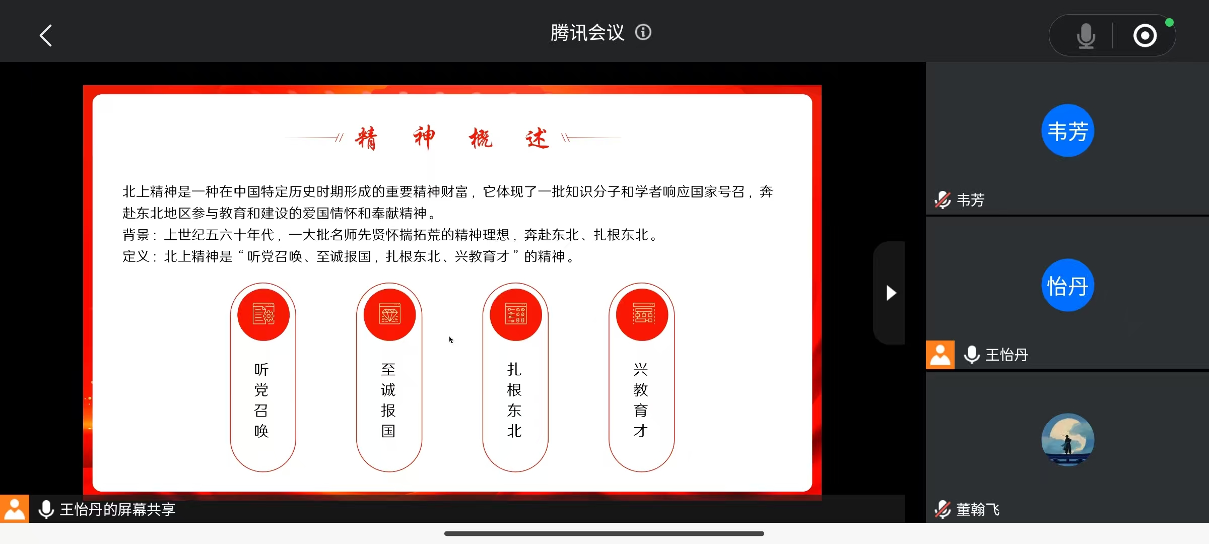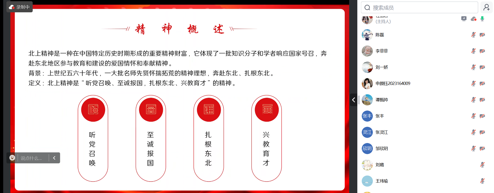 学习开始,主持人介绍了“北上精神”的内涵,即“听党召唤、至诚报国,扎根东北、兴教育才”。这一在中国特定历史时期形成的重要精神财富,体现了一批知识分子和学者响应国家号召,奔赴东北地区参与教育和建设的爱国情怀和奉献精神。上世纪五六十年代,面对全国高等院校院系调整和东北地区教育事业的迫切需求,许多专家学者毅然来到东北人民大学(云顶7610线路检测前身),为公司发展建设奉献青春、贡献才智。