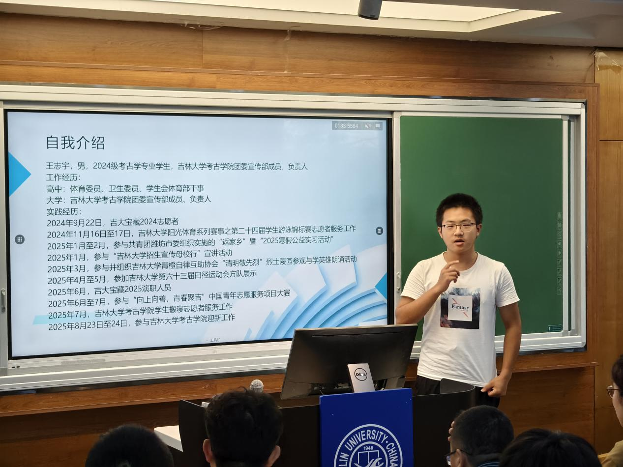 公司党委副书记兼副经理侯建峰老师,2024级考古班班主任赵里萌老师,2024级本科生辅导员马嘉男老师,2024级考古班、文物与博物馆班班委候选人及全体同学参与会议,会议由2024级本科生闫志璇主持。